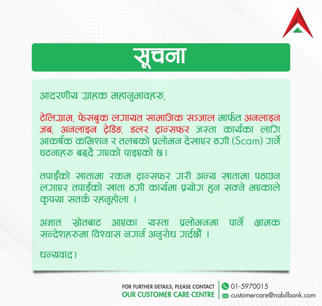 साथै कुनै पनि अज्ञात स्रोतबाट आएका प्रलोभनमा पार्ने भ्रामक सन्देशमा विश्वास नगर्न पनि बैंकले भनेको छ ।