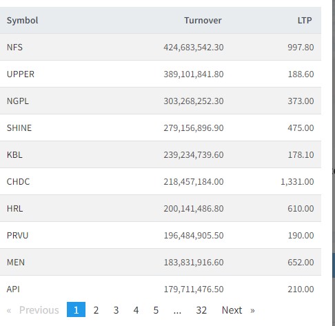 त्यस्तै, अपर तामाकोशी, ङागी गुप्र पावर, शाईन रेसङ्गा, कुमारी बैंक, सिईडिबी हाईड्रोपावर, हिमालयन रि, प्रभु बैंक, माउन्टेन इनर्जी र जानकी फाइनान्सको सर्वाधिक कारोबार भएको छ।