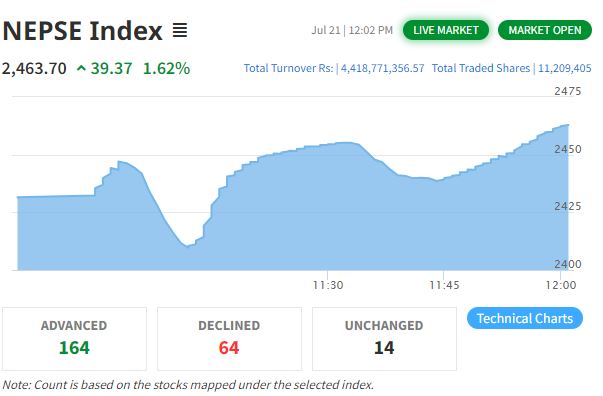 यो समयसम्म १ करोड १२ लाख ९ हजार कित्ता शेयर किनबेच भएको छ । नेप्से समेत ३९.३७ अकंले बढेर २४६३.७० बिन्दुमा पुगेको छ ।