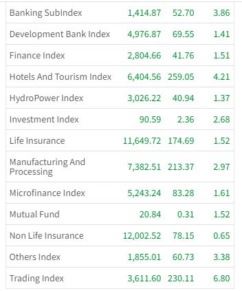 यसदिन १३ वटै उपसूचकमा हरियाली आएको छ । आइतबार बैंकिङ समूहको ३.८६ प्रतिशत, विकास बैंक समूहको १.४१ प्रतिशत, फाइनान्स समूहको १.५१ प्रतिशत, होटल तथा पर्यटन समूहको ४.२१ प्रतिशतले शेयर मूल्य बढेको छ ।