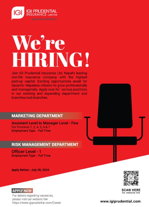 काठमाडौं । आइजीआई प्रुडेन्सियल इन्स्योरेन्स कम्पनीले विभिन्न पदका लागि कर्मचारी मागेको छ।