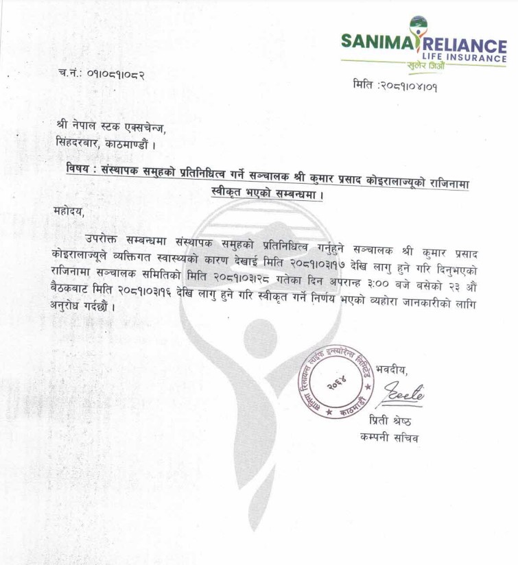 सानिमा रिलायन्स लाइफका संचालक कोइरालाको राजिनामा स्वीकृत