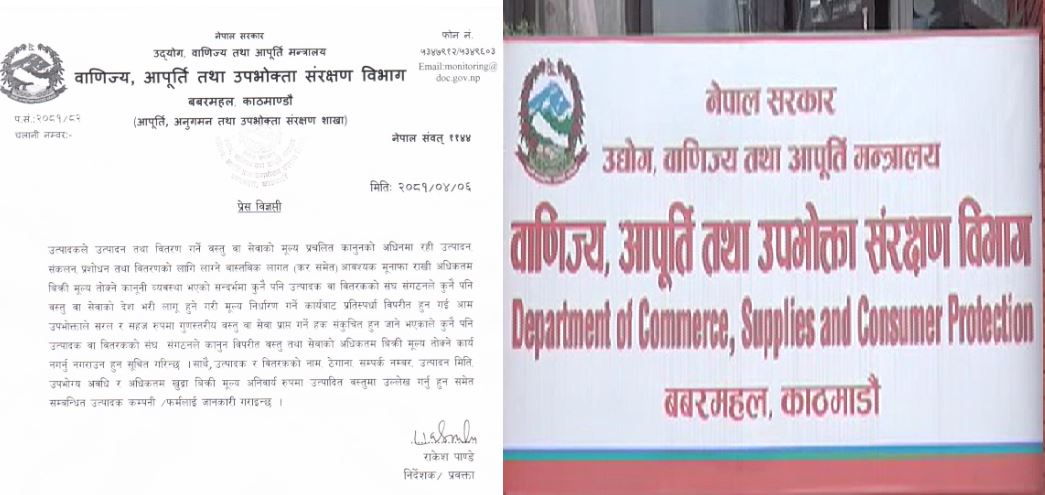 काठमाडौं । वाणिज्य, आपूर्ति तथा उपभोक्ता संरक्षण विभागले कानुन विपरित वस्तु वा सेवाको अधिकतम बिक्री मूल्य नतोक्न निर्देशन दिएको छ । विभागले आइतबार विज्ञप्ति जारि गर्दै यस्तो निर्देशन दिएको हो ।