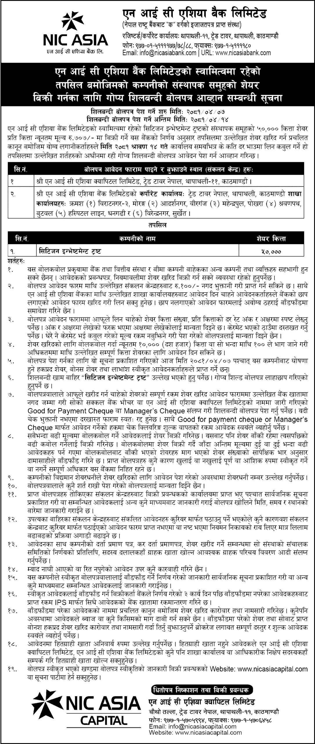 काठमाडौं । एनआईसी एशिया बैंक लिमिटेडले आफ्नो स्वामित्वमा रहेको सिटिजन इन्भेष्टमेन्ट ट्रस्ट (सीआईटी)को संस्थापक शेयर लिलाम बिक्रीमा राखेको छ । बैंकले आफ्नो स्वामित्वको ५० हजार कित्ता शेयर बिक्रीमा राखेको हो ।
