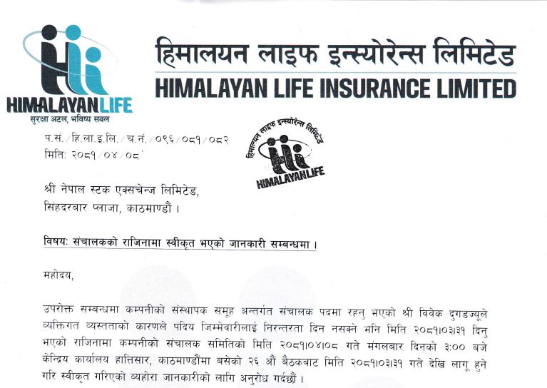 काठमाडौँ । हिमालयन लाइफ इन्स्योरेन्स लिमिटेडका संचालक विवेक दुगडको राजीनामा स्वीकृत भएको छ । साउन ८ गते बसेको संचालक समितिको बैठकले असार ३१ गतेदेखि लागु हुने गरी दुगडको राजीनामा स्वीकृत भएको हो ।