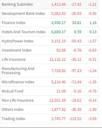 यसदिन ११ उपसूचक राताम्य भएका छन् । बुधबार बैंकिङ समूहको १.२१ प्रतिशत, विकास बैंक समूहको ०.५६ प्रतिशत, हाइड्रोपावर समूहको १.५७ प्रतिशत, इन्भेष्टमेन्ट समूहको ०.८३ प्रतिशत, जीवन बीमा समूहको ०.३१ प्रतिशत, माइक्रोफाइनान्स समूहको १.३५ प्रतिशतले शेयर मूल्य घटेको छ ।