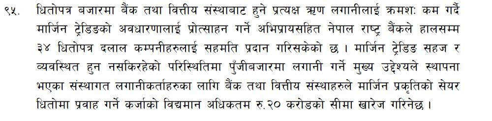 संस्थागत लगानीकर्ताहरुका लागि बैंक तथा वित्तीय संस्थाहरुले मार्जिन प्रकृतिको सेयर धितोमा प्रवाह गर्ने कर्जाको विद्यमान अधिकतम २० करोड रुपैयाँको सीमा खारेज गरिनेछ गरेको जनाएका छन् ।