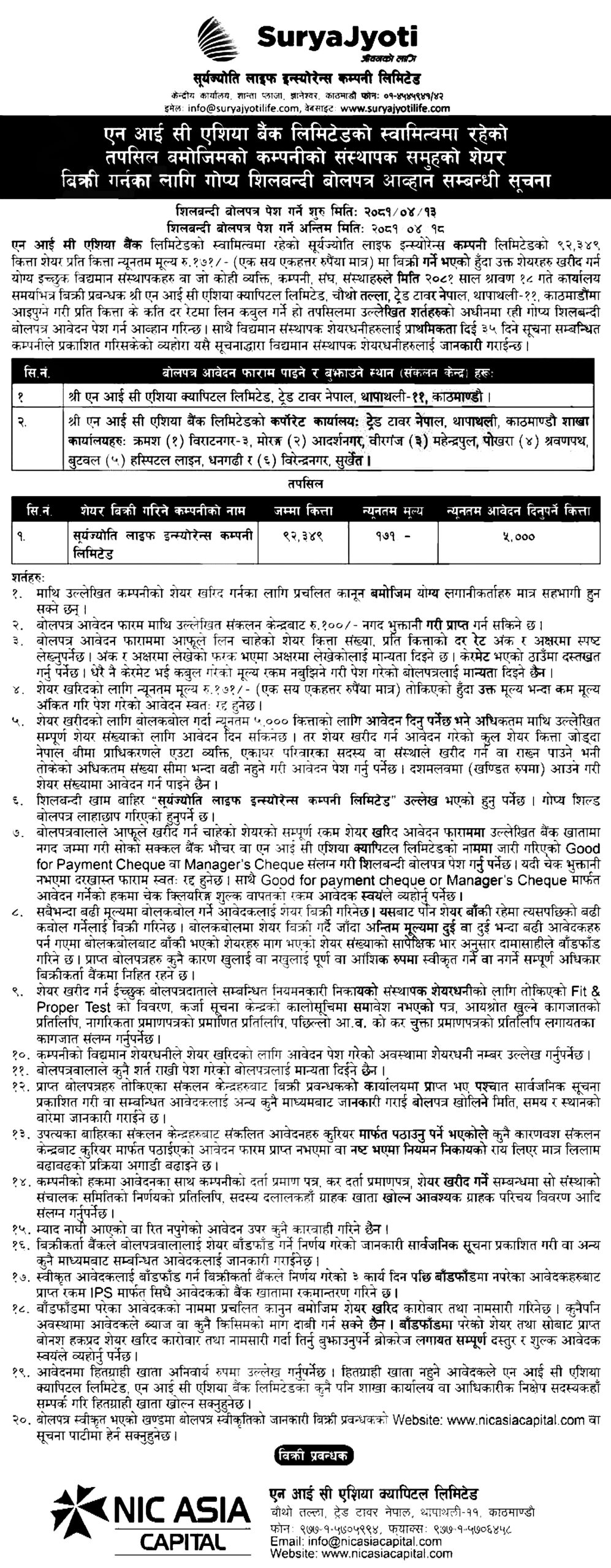 काठमाडौं । सूर्यज्योति लाइफ इन्स्योरेन्स कम्पनी लिमिटेडले संस्थापक शेयर लिलाम बिक्रीमा राखेको छ । कम्पनीले एनआईसी एशिया बैंक लिमिटेडको स्वामित्वमा रहेको ९२ हजार ३४९ कित्ता संस्थापक शेयर बिक्रीमा राखेको हो ।