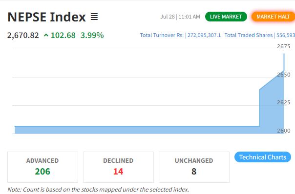 काठमाडौँ । शेयर बजारमा आज सर्किट ब्रेक लागेको छ । नेप्से ४ प्रतिशतले बढेर २६७०.८२ बिन्दुमा कायम भएको हो । सो पश्चात बजार २० मिनेटका लागि बन्द भएको छ ।