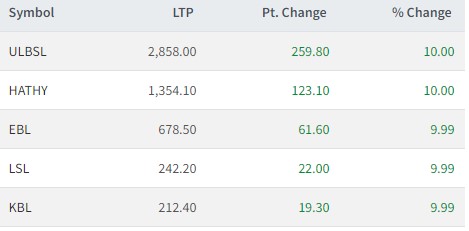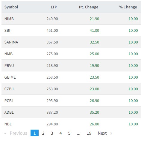 एआइइएमबी बैंक, एसबीआई बैंक, सानिमा बैंक, एनएमबी बैंक, प्रभु बैंक, ग्लोबल आइएमई बैंक, सिटिजन्स बैंक, प्राइम कर्मशीयल बैंक, कृषि विकास बैंक, नेपाल बैंक, उपकार लघुवित्त, हाथवे, एभरेष्ट बैंक, लक्ष्मी सनराईज बैंक, कुमारी बैंकको शेयरमा सकारात्मक सर्किट लागेको छ।