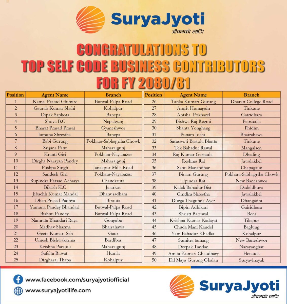 साथै सुर्य ज्योति लाइफ इन्स्योरेन्स कम्पनीभित्र उत्कृष्ट व्यवसाय गर्ने ५० जना बीमा अभिकर्ताको सूचि बीमापोष्टलाई प्राप्त भएको छ । उक्त सूचि निम्न अनुसार रहेको छ ।
