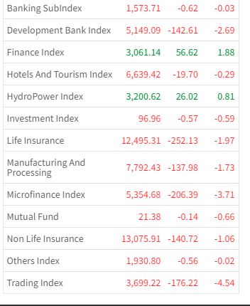 यसदिन कारोबार भने निकै उच्च भएको देखिन्छ । सोमबार ११ उपसचूक राताम्य भएका छन् । आज र्बैंकिङ समूहको ०.०३ प्रतिशत, विकास बैंक समहको २.६९ प्रतिशत, होटल तथा पर्यटन समूहको ०.२९ प्रतिशतसहित ११ कम्पनीको शेयर घटेको हो ।
