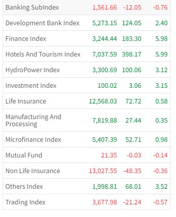 यसदिन ९ समूहको शेयर मूल्यमा उछाल देखिएको छ । मंगलबार विकास बैंकको २.४० प्रतिशत, फाइनान्स समूहको ५.९८ प्रतिशत, होटल तथा पर्यटन समूहको ५.९९ प्रतिशत, हाइड्रोपावर समूहको ३.१२ प्रतिशत, इन्भेष्टमेन्ट समूहको ३.१५ प्रतिशतले शेयर मूल्य बढेको छ ।