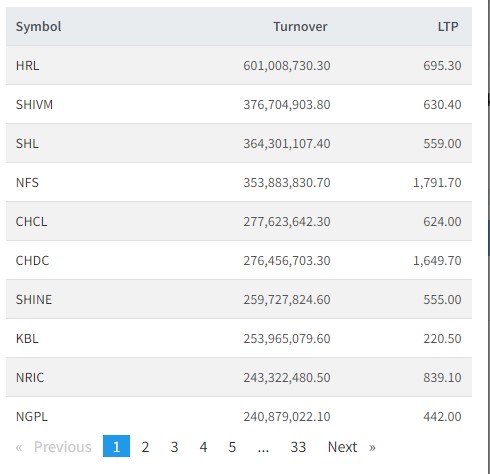 त्यस्तै, शिवम सिमेन्टस, सोल्टि होटल, चिलिमे हाईड्रोपावर, नेपाल फाइनान्स, सिईडिबी हाईड्रोपावर, शाईन रेसुङ्गा बैंक, ङादी पावर र नेपाल रिको सर्वाधिक कारोबार भएको छ।