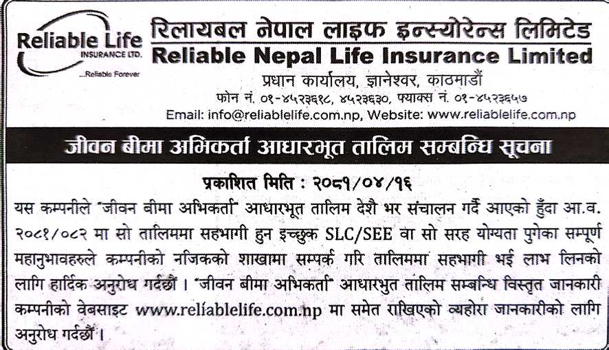 काठमाडौं । रिलायबल नेपाल लाइफ इन्स्योरेन्स लिमिटेडले जीवन बीमा अभिकर्ता आधारभूत तालिम सञ्चालन गर्ने भएको छ ।