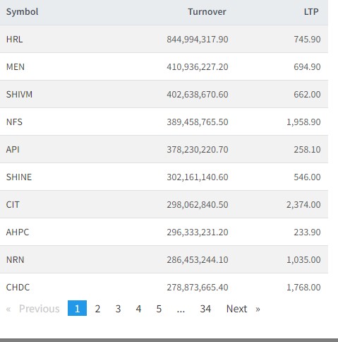 त्यस्तै, माउन्टेन इनर्जी, शिवम सिमेन्टस, नेपाल फाइनान्स, अपी पावर, शाईन रेसु्ङ्गा, सिआईटी, अरुण भ्याली, एनआरएन इन्फ्रास्टक्चर र सिईडिबी हाईड्रोपावरको सर्वाधिक कारोबार भएको छ ।