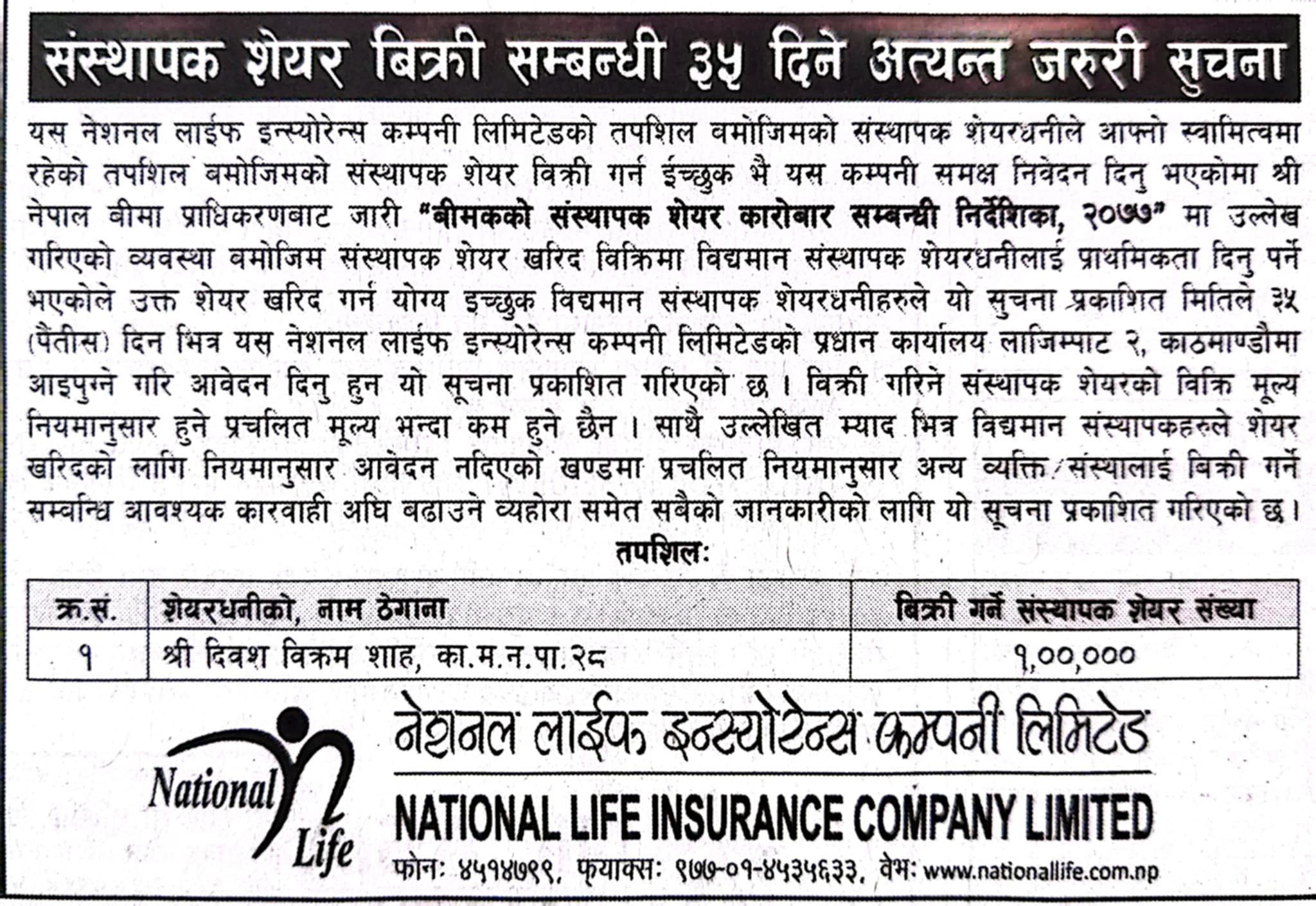 काठमाडौं । नेशनल लाइफ इन्स्योरेन्स कम्पनी लिमिटेडले संस्थापक शेयर बिक्रीमा राखेको छ । कम्पनीले संस्थापक शेयरधनी दिवश विक्रम शाहको नाममा रहेको एक लाख कित्ता संस्थापक शेयर बिक्रीमा राखेको हो ।