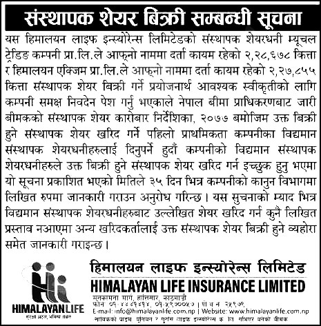 काठमाडौं । हिमालयन लाइफ इन्स्योरेन्स लिमिटेडले संस्थापक शेयर बिक्रीमा राखेको छ । कम्पनीले संस्थापक शेयरधनीहरूको नाममा रहेको ४ लाख ५६ हजार ५३३ कित्ता संस्थापक शेयर बिक्रीमा राखेको हो ।