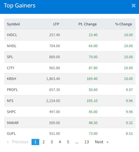 आज एचआइडिसी हाइड्रोपावर, नेपाल हाइड्रो डेपलभर, शुभम पावर, सिटी होटल, कुथेली बुखरी स्मल हाइड्रोपावर, प्रोग्रेशिभ फाइनान्स, नेपाल फाइनान्स र सानिमा माइ हाइड्रोपावरको शेयरमूल्यमा सकारात्मक सर्किट लागेको छ ।