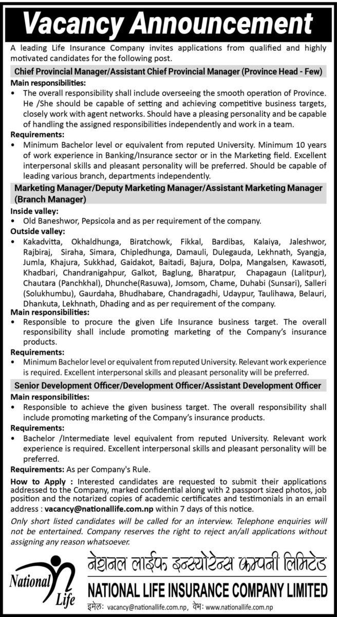 कम्पनीले काठमाडौं उपत्यकासहित देशका विभिन्न स्थानहरुमा रहेका शाखा कार्यालयको लागि ब्रान्च म्यानेजर र प्रदेश प्रमुखमा कर्मचारी माग गरेको छ । सो पदमा आवेदन दिने उम्मेदवारहरुमध्ये अनुभवि र क्षमतावानलाई बढी प्राथमिकता दिने कम्पनीले जनाएको छ ।
