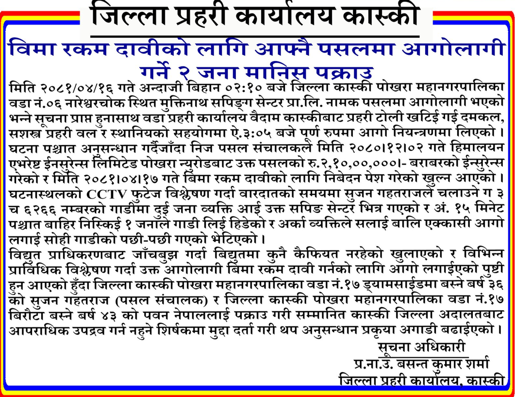 जिल्ला प्रहरी कार्यालय कास्कीका डिएसपी बसन्त कुमार शर्माले बीमा दावी भुक्तानी लिन आफ्नै पसलमा आगो लगाउने गहतराज पक्राउ गरेको पुष्टि गर्दै प्रहरीले थप अनुसन्धान पश्चात उक्त घट्नाका सबै दोषीहरुलाई कानुनी दायरामा ल्याउने बताए । डिएसपी शर्माले पसल सञ्चालकले आगो लागेकै भोलिपल्ट जिल्ला प्रहरी कार्यालयमा बीमा दावी भुक्तानीको प्रक्रिया पूरा गर्न प्रहरी प्रतिवेदन माग गर्दै निवेदन दर्ता गराएका थिए । प्रहरीले छानविनको क्रममा पसलमा आगो लगाउने कार्यमा सञ्चालक स्वयम् संलग्न रहेको सिसीटिभी फुटेज समेत भेटिएपछि आज पक्राउ गरेको हो ।