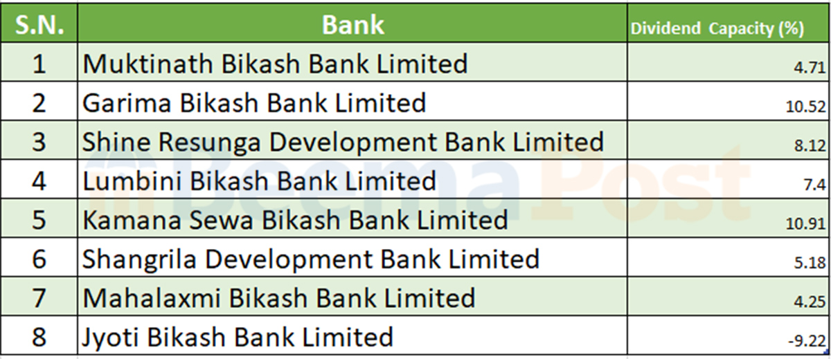 साथै, गरिमा विकास बैंकले १०.५२ प्रतिशत, शाइन रेसुङ्गाले ८.१२ प्रतिशत, लुम्बिनी विकास बैंकले ७.४ प्रतिशत र सांग्रिला डेभलपमेन्ट बैंकको ४.२५ प्रतिशत लाभांश दिन सक्ने क्षमता रहेको छ ।
