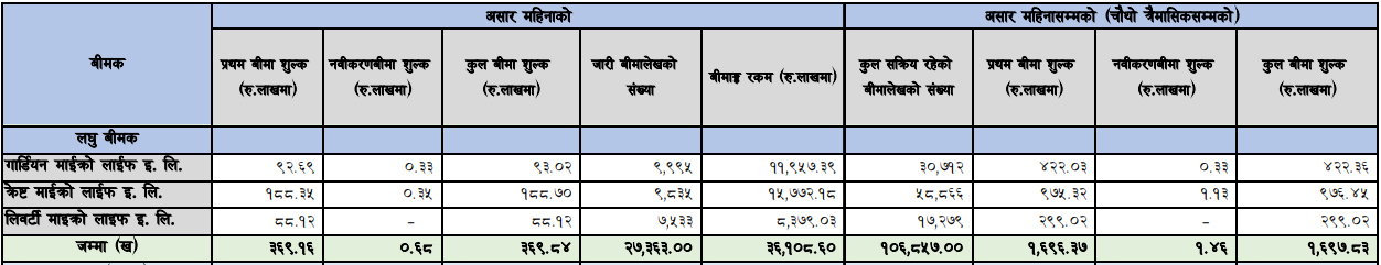 त्यसैगरी दोस्रोमा गार्डियन माइक्रो लाइफ इन्स्योरेन्स लिमिटेडले ४ करोड २२ लाख ३६ हजार रुपैयाँ बराबरको कुल बीमा शुल्क आर्जन गर्न सफल भएको छ । त्यस्तै लिवर्टी माइक्रो लाइफ इन्स्योरेन्स लिमिटेडले असार मसान्तसम्म २ करोड ९९ लाख रुपैयाँ बराबरको कुल बीमा शुल्क आर्जन गरेको छ ।
