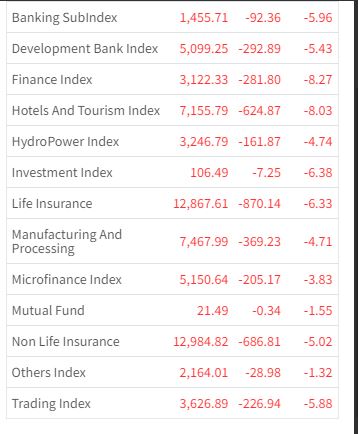 यसदिन १३ वटै उपसूचक राताम्य भएका छन् । आज बैंकिङ्ग समूहको ५.९६ प्रतिशत, विकास बैंक समूहको ५.४३ प्रतिशत, फाइनान्स समूहको ८.२७ प्रतिशत, होटल तथा पर्यटन समूहको ८.०३ प्रतिशतले शेयर मूल्य घटेको छ ।