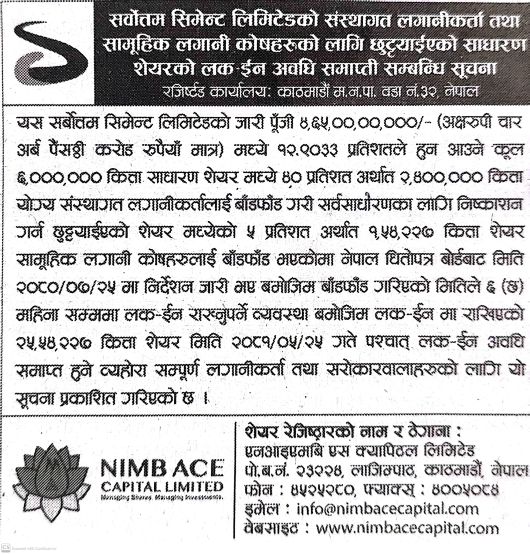 काठमाडौं । सर्वाेत्तम सिमेन्ट लिमिटेडको २५ लाख ५४ हजार २२७ कित्ता शेयरको ‘लक इन’ अवधि भदौ २५ गतेपछि सकिने भएको छ ।