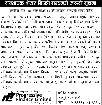 काठमाडौं । प्रोग्रेशिभ फाइनान्स लिमिटेडले संस्थापक शेयर बिक्रीमा राखेको छ । कम्पनीले संस्थापक शेयरधनीको नाममा रहेको शेयर बिक्रीमा राखेको हो ।