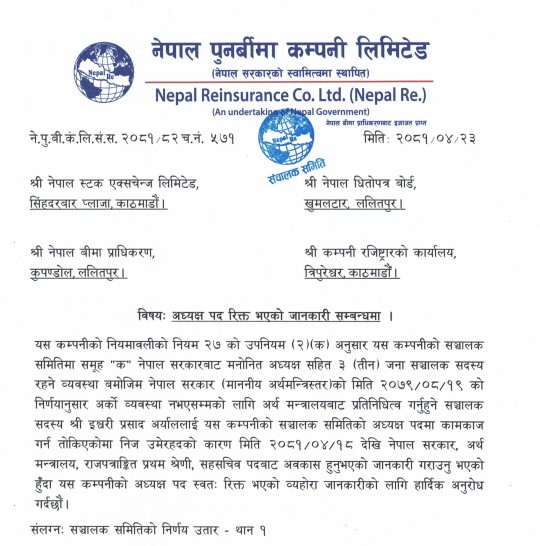 नेपाल पुनर्बीमा कम्पनीको अध्यक्ष पद रिक्त