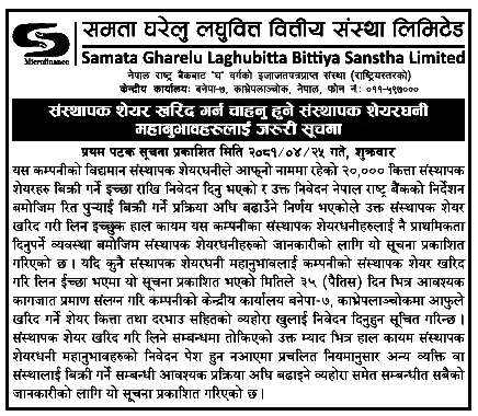 काठमाडौं । समता घरेलु लघुवित्त वित्तीय संस्था लिमिटेडले संस्थापक शेयर बिक्रीमा राखेको छ । कम्पनीले संस्थापक शेयरधनीको नामको २० हजार कित्ता शेयर बिक्रीमा राखेको हो ।