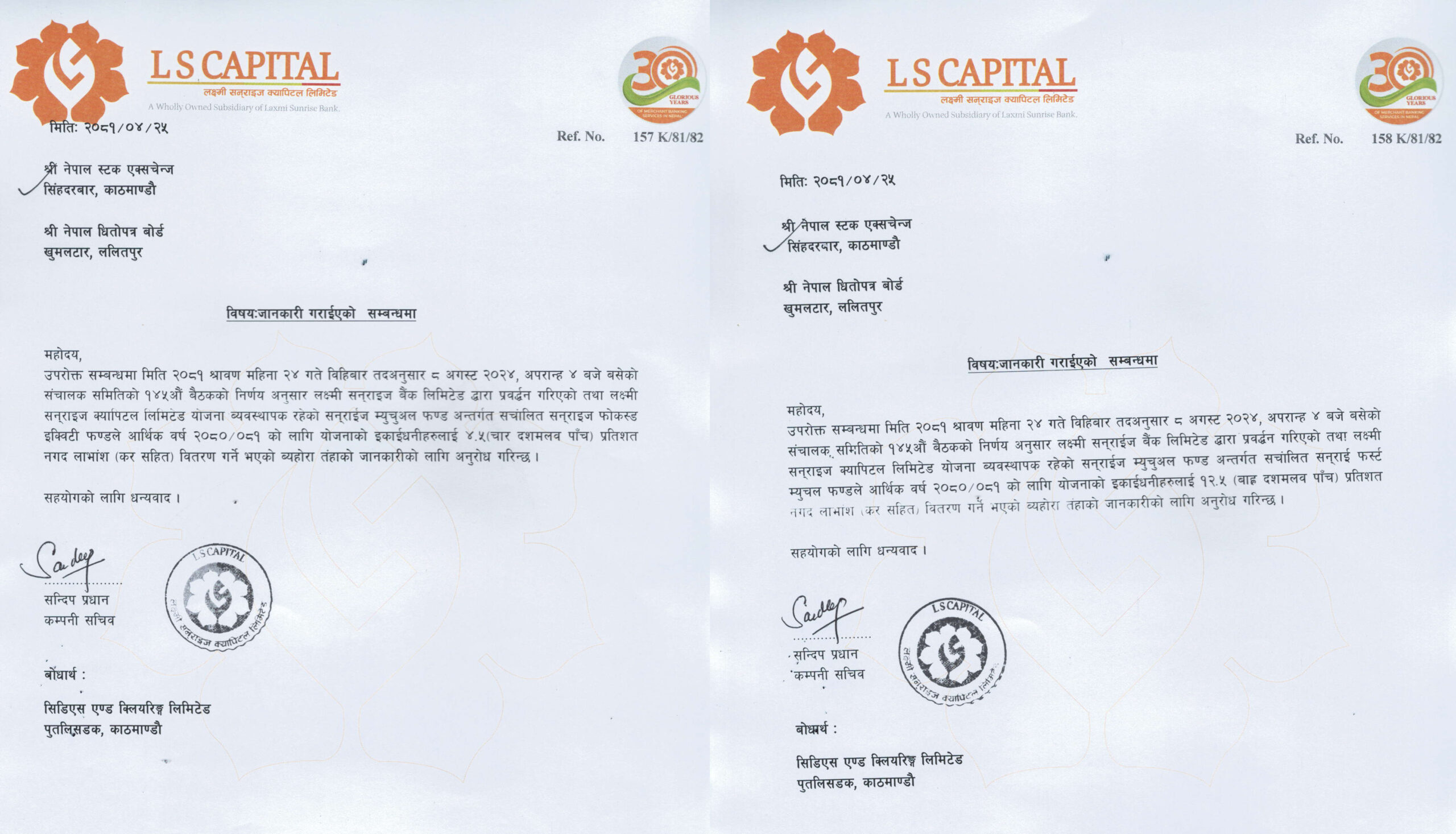 काठमाडौं । लक्ष्मी सनराइज क्यापिटलको व्यवस्थापनमा सञ्चालित सनराइज फोकस्ड इक्विटी फन्ड र सनराइज फर्स्ट म्युचुअल फन्डको लाभांश घोषणा भएको छ ।