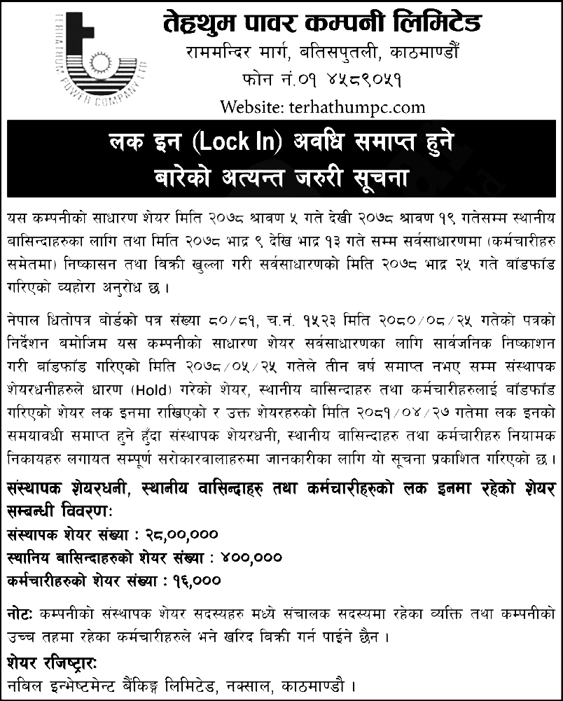 तेह्रथुम पावर कम्पनीको ३२ लाख १६ हजार कित्ता शेयरको ‘लक इन’ समाप्त