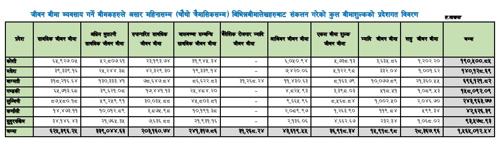 एक वर्षमा जीवन बीमा कम्पनीहरुले कुन प्रदेशबाट कति गरे व्यवसाय ? (सूचीसहित)