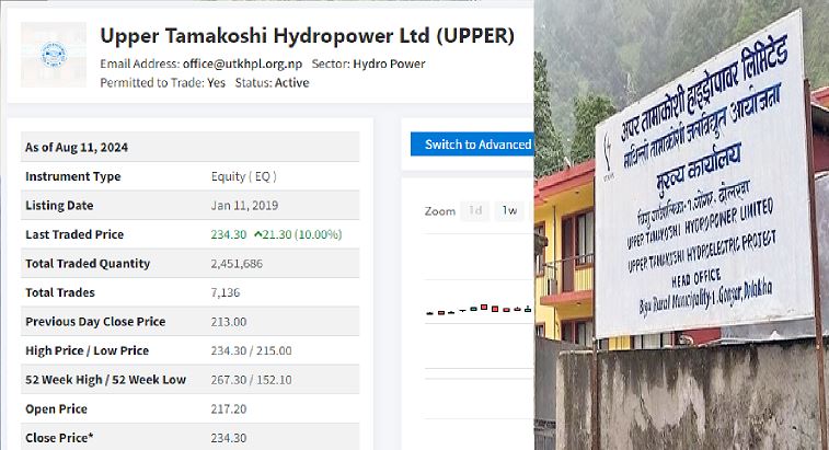 काठमाडौँ । लामो समयदेखि निरन्तर घट्दो क्रममा रहेको अपर तामाकोशीको शेयरमा आज भने सकारात्मक सर्किट लागेको छ । कम्पनीको शेयर आज प्रतिकित्ता २१ रुपैयाँ २० पैसाले बढेर २३४ रुपैयाँ ३० पैसा पुगेको हो ।