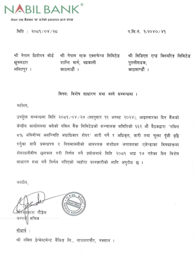 काठमाडौं । नबिल बैंक लिमिटेडले भदौ १७ गते विशेष साधारणसभा डाकेको छ । बैंकको साउन २७ गते बसेको सञ्चालक समितिको बैठकले सभा डाकेको हो ।