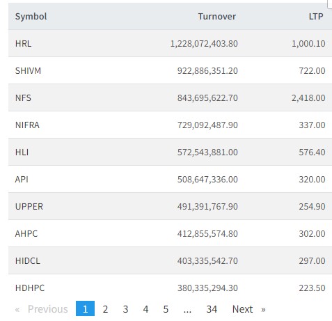 त्यस्तै, शिवम सिमेन्टस, नेपाल फाइनान्स, निफ्रा, हिमालयन लाइफ, अपी पावर, अपर तामाकोशी, अरुण भ्याली, हाईड्रो इलेक्टेसिटि इन्भेष्टमेन्ट एण्ड डेभलपमेन्ट र हिमाल दोलखाको सर्वाधिक कारोबार भएको छ।
