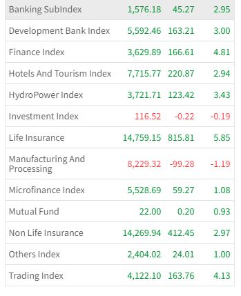 यसदिन ११ उपसूचकमा हरियाली आएको छ । सोमबार बैकिङ समूहको २.९५ प्रतिशत, विकास बैंक समूहको ३ प्रतिशत, फाइनान्स समूहको ४.८१ प्रतिशत, होटल तथा पर्यटन समूहको २.९४ प्रतिशतले शेयर मूल्य बढेको छ ।
