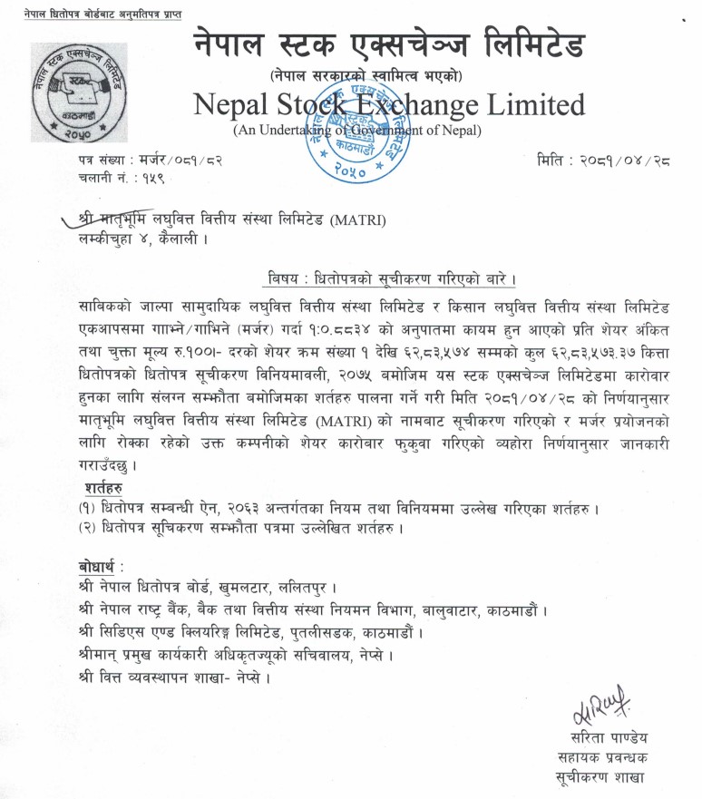 मर्जरपछि लघुवित्तको कुल ६२ लाख ८३ हजार ५७३.३७ कित्ता शेयर मातृभूमि लघुवित्तको नाममा नेप्सेमा सूचीकृत भएको छ।