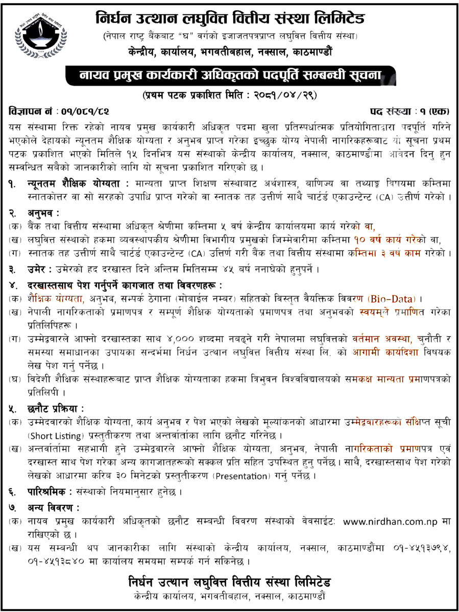 निर्धन उत्थान लघुवित्तको डीसिईओ बन्ने सुवर्ण अवसर, कति चाहिन्छ शैक्षिक योग्यता र अनुभव ?