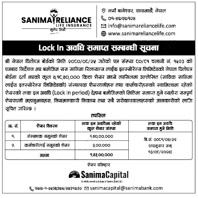 साबिक सानिमा लाइफको १ करोड ४३ लाख कित्ता शेयरको ‘लक इन’ समाप्त