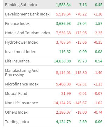 मंगलबार पाँच उपसूचकमा मात्र हरियाली देखिएको छ । यसदिन बैंकिङ समूहको ०.४५ प्रतिशत, इन्भेष्टमेन्ट समूहको ०.०८ प्रतिशत, फाइनान्स समूहको १.५७ प्रतिशत, जीवन बीमा समूहको ०.५४ प्रतिशत र व्यापार समूहको ०.०६ प्रतिशतले शेयर मूल्य बढेको छ ।