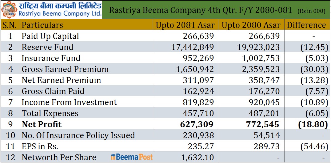 गत वर्ष कम्पनीको लगानीबाट हुने आय समेत १०.८९ प्रतिशतले घटेर ८१ करोड ९८ लाख रुपैयाँमा झरेको छ । कम्पनीले गत वर्ष कुल खर्च समेत ६ प्रतिशतले घटाएर ४४ करोड ७७ लाख रुपैयाँमा सिमित बनाएको छ । २६ करोड ६६ लाख ३९ हजार रुपैयाँ चुक्ता पूँजी रहेको यस कम्पनीको रिजर्भ फण्ड १२.४५ प्रतिशतले घटेर १७ अर्ब ४४ करोड २८ लाख रुपैयाँमा झरेको छ । जुन अघिल्लो वर्ष १९ अर्ब ९२ करोड ३० लाख रुपैयाँ थियो ।