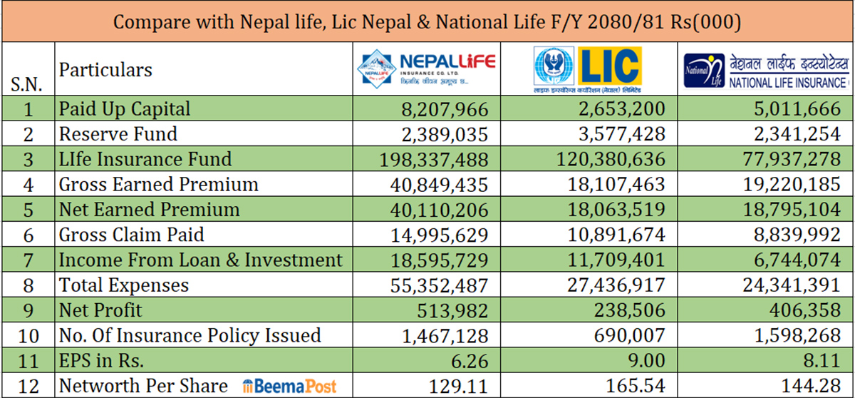 प्रतिशेयर नेटवर्थको आधारमा तीन कम्पनीबीच गरेको तुलनात्मक अध्ययनको आधारमा एलआईसी (नेपाल) अगाडि रहेको छ । कम्पनीको प्रतिशेयर नेटवर्थ १६५ रुपैयाँ ५४ पैसा रहेको छ । त्यस्तै, नेशनल लाइफको १४४ रुपैयाँ २८ पैसा र नेपाल लाइफको १२९ रुपैयाँ ११ पैसा रहेको छ ।