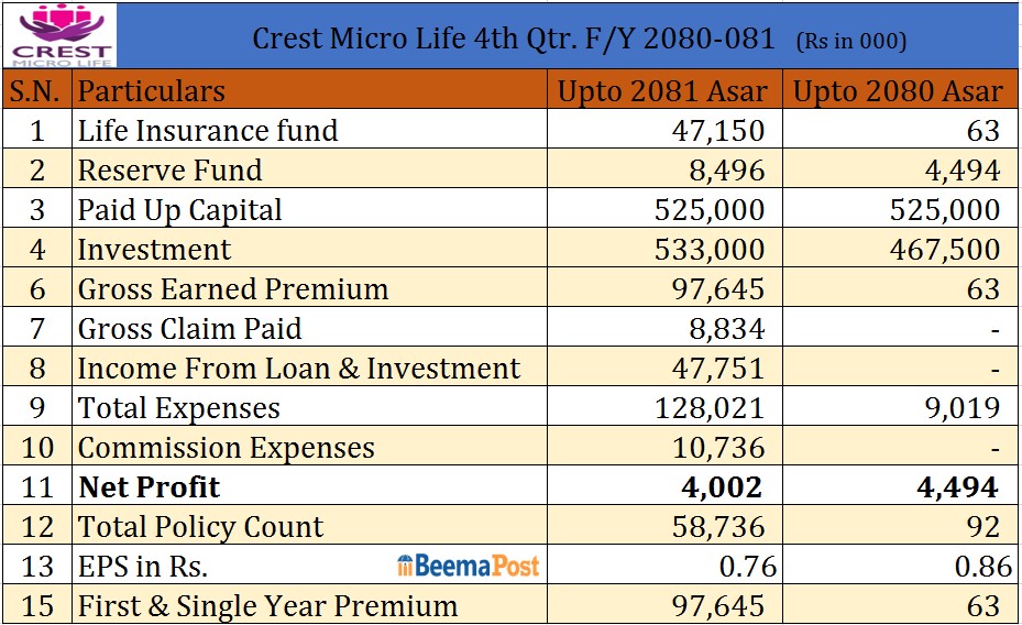 काठमाडौं । स्थापनाको छोटो समयमा नै उल्लेख्य प्रगति गर्दै अघि बढेको क्रेष्ट माइक्रो इन्स्योरेन्स कम्पनीले गत आवमा आशलाग्दो नतिजा दिन सफल भएको छ । क्रेस्ट माइक्रो लाइफ इन्स्योरेन्स लिमिटेडले गत आर्थिक वर्षमा ४० लाख रुपैयाँ खुद नाफा कमाएको छ । यस कम्पनीले अघिल्लो आर्थिक वर्षमा करीब ४५ लाख रुपैयाँ नाफा कमाएको थियो ।