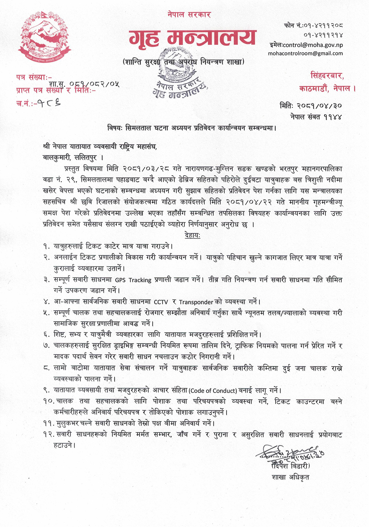मन्त्रालयले अबदेखि सम्पूर्ण सवारी साधनमा जीपीएस ट्र्याकिङ प्रणाली र तीव्र गति नियन्त्रण गर्न सवारी साधनमा गति सीमित गर्ने उपकरण जडान गर्ने भनेको छ । साथै, आ–आफ्ना सार्वजनिक सवारी साधनमा सिसिटिभि र ट्रान्सपोन्डरको ब्यवस्था गर्ने निर्देशन दिएको छ ।