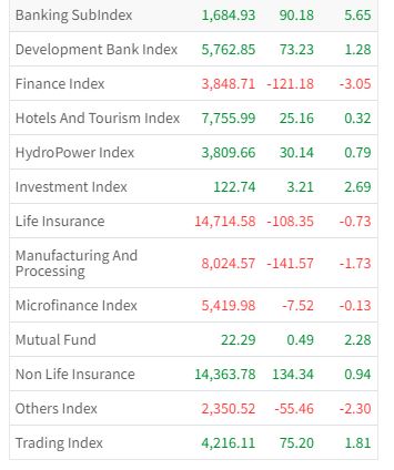 बिहिबार आठ उपसूचकमा हरियाली आएको छ । यसदिन बैंकिङ समूहको ५.६५ प्रतिशत, विकास बैंक समूहको १.२८ प्रतिशत, होटल तथा पर्यटन समूहको ०.३२ प्रतिशत, हाइड्रोपावर समूहको ०.७९ प्रतिशतले शेयर मूल्य बढेको छ ।
