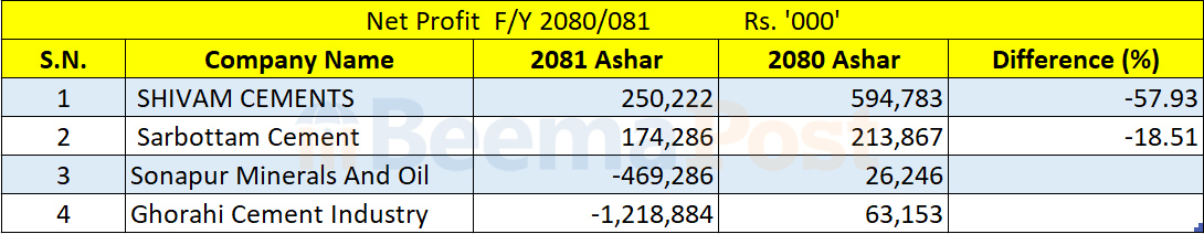 दुई सिमेन्ट कम्पनीको नाफा भने ऋणात्मक अवस्थामा रहेको छ । अघिल्लो आर्थिक वर्षमा २ करोड ६२ लाख रुपैयाँ नाफा कमाएको सोनापुर गत आर्थिक वर्षमाभने ४६ करोड ९२ लाख रुपैयाँ ऋणात्मक छ । यता, घोराही सिमेन्ट पनि १ अर्ब २१ करोड ८८ लाख रुपैयाँ ऋणत्मक अवस्थामा रहेको छ ।