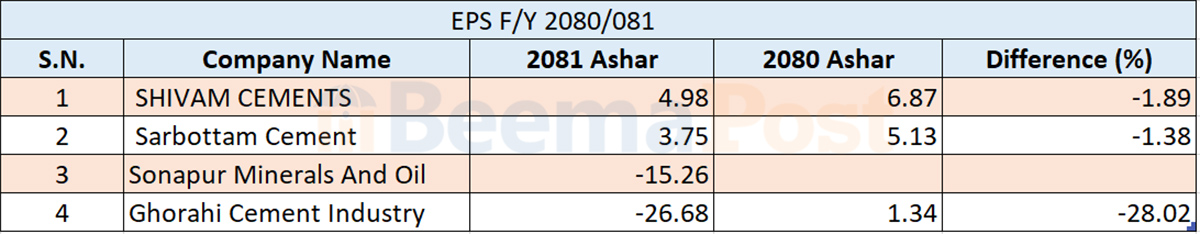 सर्वोत्तम सिमेन्टको प्रतिशेयर आम्दानी ३.७५ रुपैयाँ हुँदा अन्य दुई कम्पनीको भने ऋणात्मक रहेको छ । सोनापुरको १५.२६ रुपैयाँ र घोराहीको २६.६८ रुपैयाँ प्रतिशेयर आम्दानी ऋणात्मक रहेको छ ।